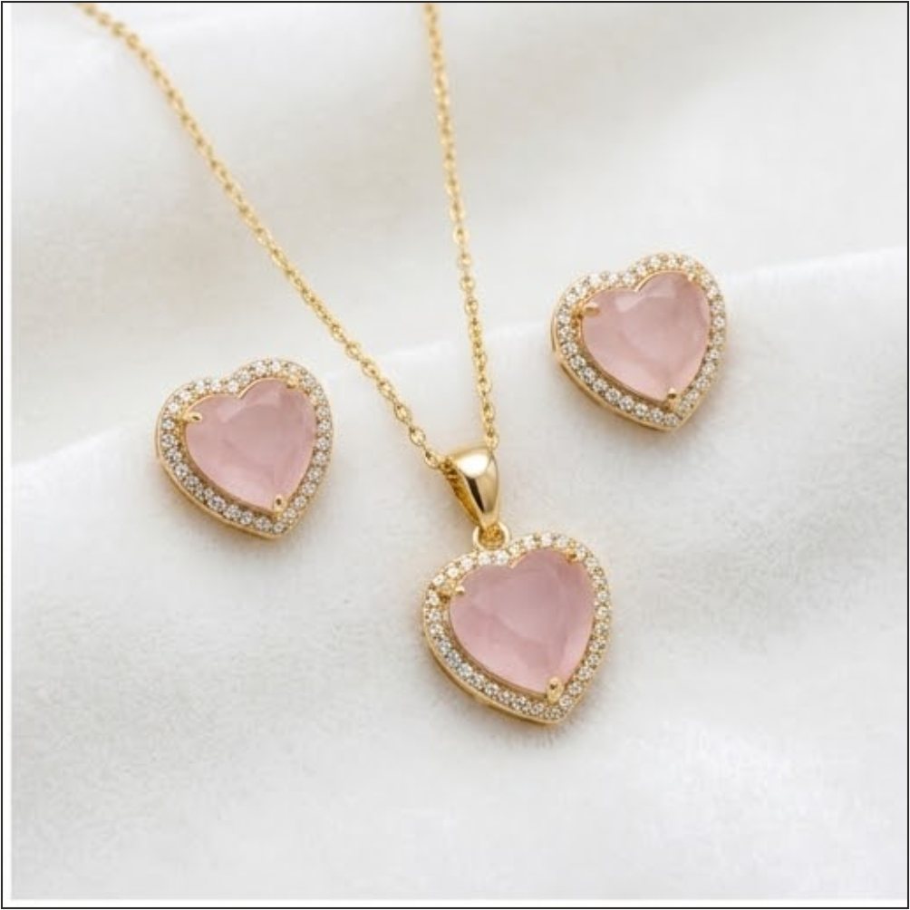 At the heart of this set lies a delicate soft pink gemstone, further enhanced by a shimmering halo of white stones. The intricate detailing exudes charm, making it an ideal choice for both casual and formal events.