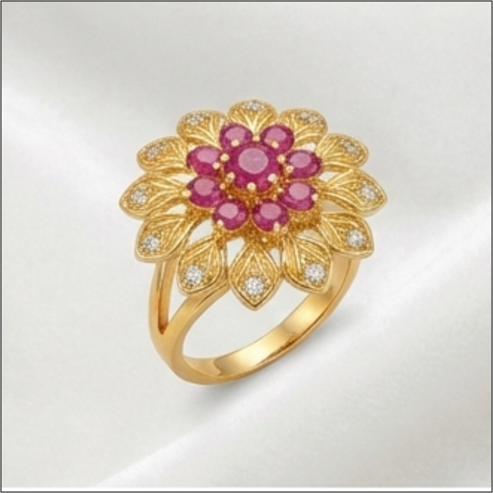 Blossom with passion and elegance in this exquisite 22K gold ring from Suhagan Abhushan. Crafted as a radiant flower with finely detailed petal layers, it features a stunning cluster of vibrant rubies at the center encircled by twinkling diamonds for irresistible sparkle. A timeless symbol of love, vitality, and sophistication – perfect for special occasions or as a cherished daily adornment celebrating feminine grace and marital joy.